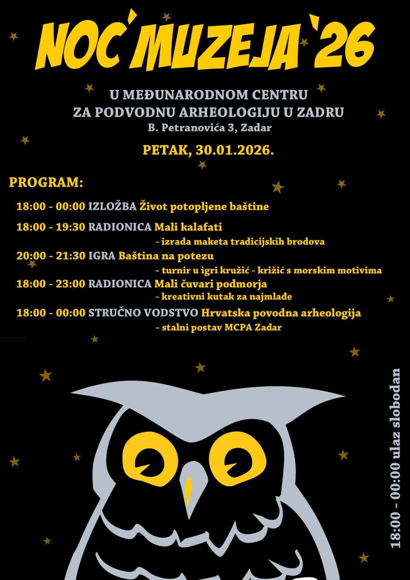 U sklopu manifestacije 21. Noć muzeja, 30. siječnja 2026. godine u Međunarodnom centru za podvodnu arheologiju u Zadru održana je kreativna radionica „Mali kalafati“, u suorganizaciji Zajednice tehničke kulture Zadarske županije i Društva informatičara...