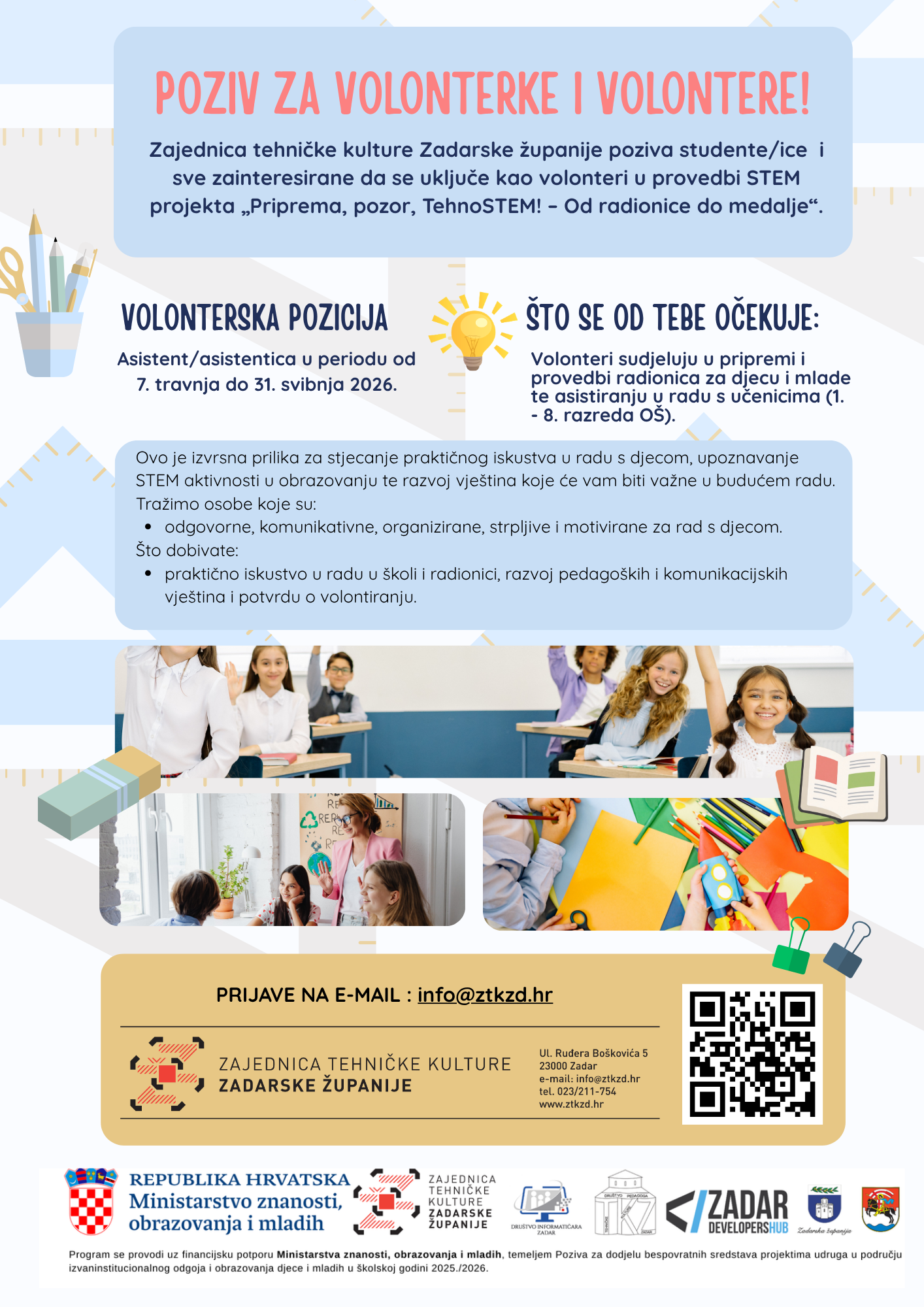 S velikim zadovoljstvom objavljujemo da je u Centru za mlade Zadar održan TehnoSTEM dan u sklopu projekta Zajednice „Priprema, pozor, TehnoSTEM! – Od radionice do medalje“, koji se financira bespovratnim sredstvima Ministarstva znanosti, obrazovanja...