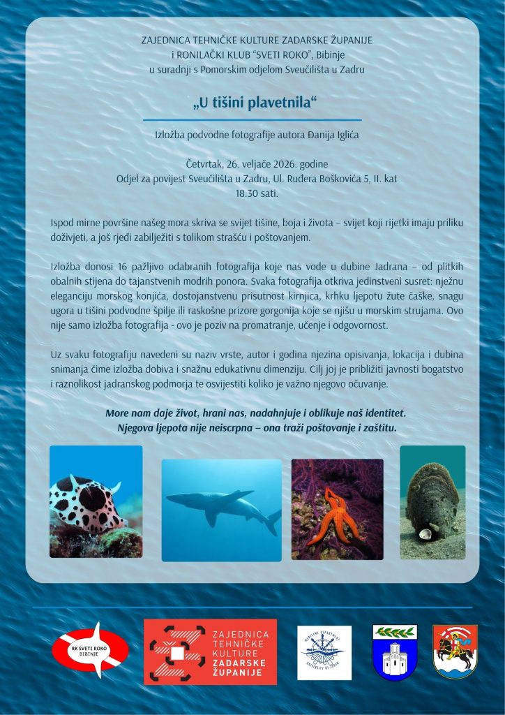 Zajednica tehničke kulture Zadarske županije i Ronilački klub “Sveti Roko” iz Bibinja u suradnji s Pomorskim odjelom Sveučilišta u Zadru pozivaju Vas na otvorenje izložbe podvodne fotografije autora Đanija Iglića – „U tišini plavetnila“– u četvrtak, 26. veljače, 2026. godine na Odjelu za povijest Sveučilišta u Zadru (Ul. Ruđera Boškovića 5, II. kat), s početkom u 18.30 sati.