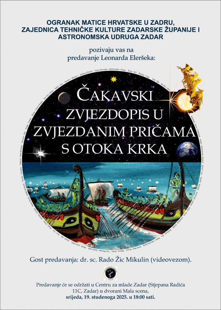 Predavanje “Čakavski zvjezdopis u zvjezdanim pričama s otoka Krka” u organizaciji Ogranka Matice hrvatske u Zadru, Zajednice tehničke kulture Zadarske županije i Astronomske udruge Zadar održat će se 📅 19. studenoga 2025. u 18:00 sati u 📍 Centru za mlade Zadar (dvorana Mala scena)..🌠