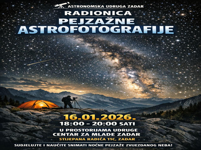 Članovi Astronomske udruge Zadar u Centru za mlade Zadar održali su dvije radionice pejzažne astrofotografije. Radionica održana 16. siječnja 2026. bila je pod vodstvom Dalibora Bučića, dok je radionicu 17. siječnja vodio Šime Barešić. Sudionici su se tijekom radionica upoznali s tehnikama fotografiranja noćnog neba u kombinaciji s pejzažem, uz poseban naglasak na pravilnu pripremu snimanja, odabir lokacije, optimalne postavke fotoaparata te osnove obrade astrofotografija. Radionice su bile namijenjene svim zaljubljenicima u astronomiju, fotografiju i prirodu, neovisno o prethodnom znanju ili iskustvu, te su dio kontinuiranih aktivnosti Astronomske udruge Zadar usmjerenih na popularizaciju astronomije i znanosti.