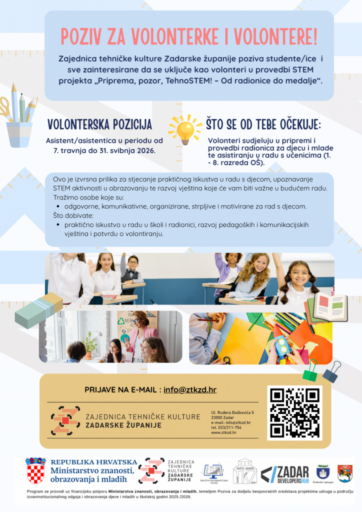 Na radionicama, između ostalih, sudjeluju i volonteri – studentice Odjela za izobrazbu učitelja i odgojitelja Sveučilišta u Zadru kako bi teorijska znanja proveli u praktičnu nastavu s djecom.